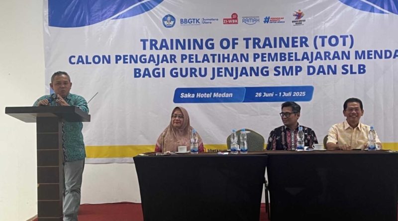 Medan, 26 Juni 2025 — Kepala Balai Penjaminan Mutu Pendidikan (BPMP) Provinsi Sumatera Utara, Tajuddin Idris, S.Si, MT, secara resmi membuka kegiatan Training of Trainer (ToT) Calon Pengajar Pelatihan Pembelajaran Mendalam (PM) bagi guru jenjang Pendidikan Dasar dan Menengah (Dikdasmen) di Hotel Saka, Medan. Kegiatan ini berlangsung mulai tanggal 26 Juni hingga 1 Juli 2025.