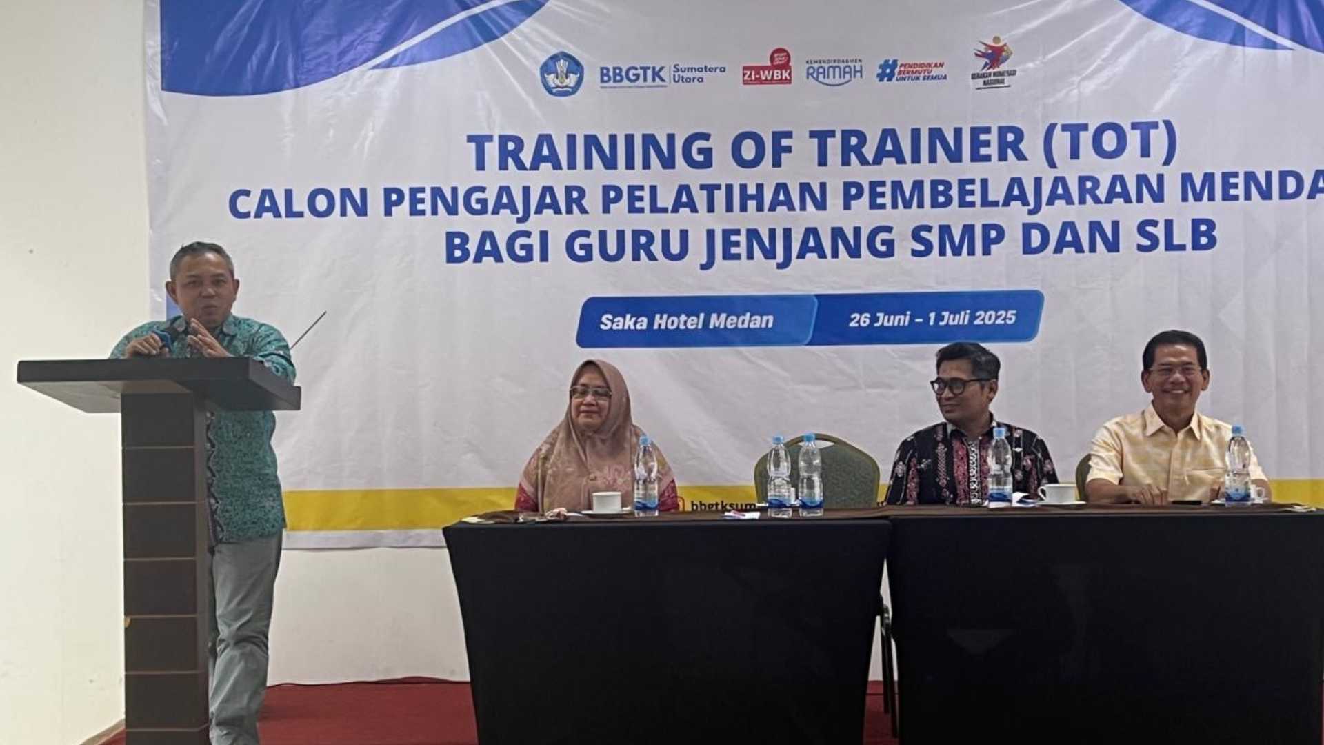 Medan, 26 Juni 2025 — Kepala Balai Penjaminan Mutu Pendidikan (BPMP) Provinsi Sumatera Utara, Tajuddin Idris, S.Si, MT, secara resmi membuka kegiatan Training of Trainer (ToT) Calon Pengajar Pelatihan Pembelajaran Mendalam (PM) bagi guru jenjang Pendidikan Dasar dan Menengah (Dikdasmen) di Hotel Saka, Medan. Kegiatan ini berlangsung mulai tanggal 26 Juni hingga 1 Juli 2025.