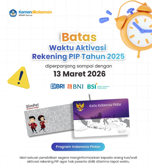 Sehubungan dengan hal tersebut, satuan pendidikan diharapkan dapat berperan aktif dalam menyampaikan informasi kepada peserta didik dan orang tua atau wali terkait perpanjangan batas waktu aktivasi rekening PIP Tahun 2025. Sekolah juga diimbau untuk membantu melakukan pendampingan serta memastikan proses aktivasi dan pencairan dana berjalan sesuai dengan ketentuan yang tercantum dalam Peraturan Sekretaris Jenderal Kemendikdasmen Nomor 10 Tahun 2025 tentang Petunjuk Pelaksanaan Program Indonesia Pintar Pendidikan Dasar dan Menengah.